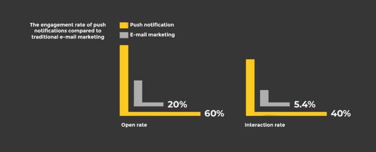 60% of users open a push notification, while only 20% of emails are delivered. After opening a message, 40% of people click or interact with the push notification, compared to only 5.4% of emails.